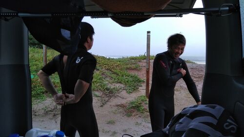 お疲れ〜 行ってきました「先端」に。 波はセットで腹〜 風はやはり合ってるが、波が少ねえ、人は多い。 乗れるけど、上潮のまあ35点。 朝イチからNGYMが張り切ってて、後はKW神。 「おい、起きろ!」って起こしたんだが、外に出たら雨でしょう〜 「やめよう…